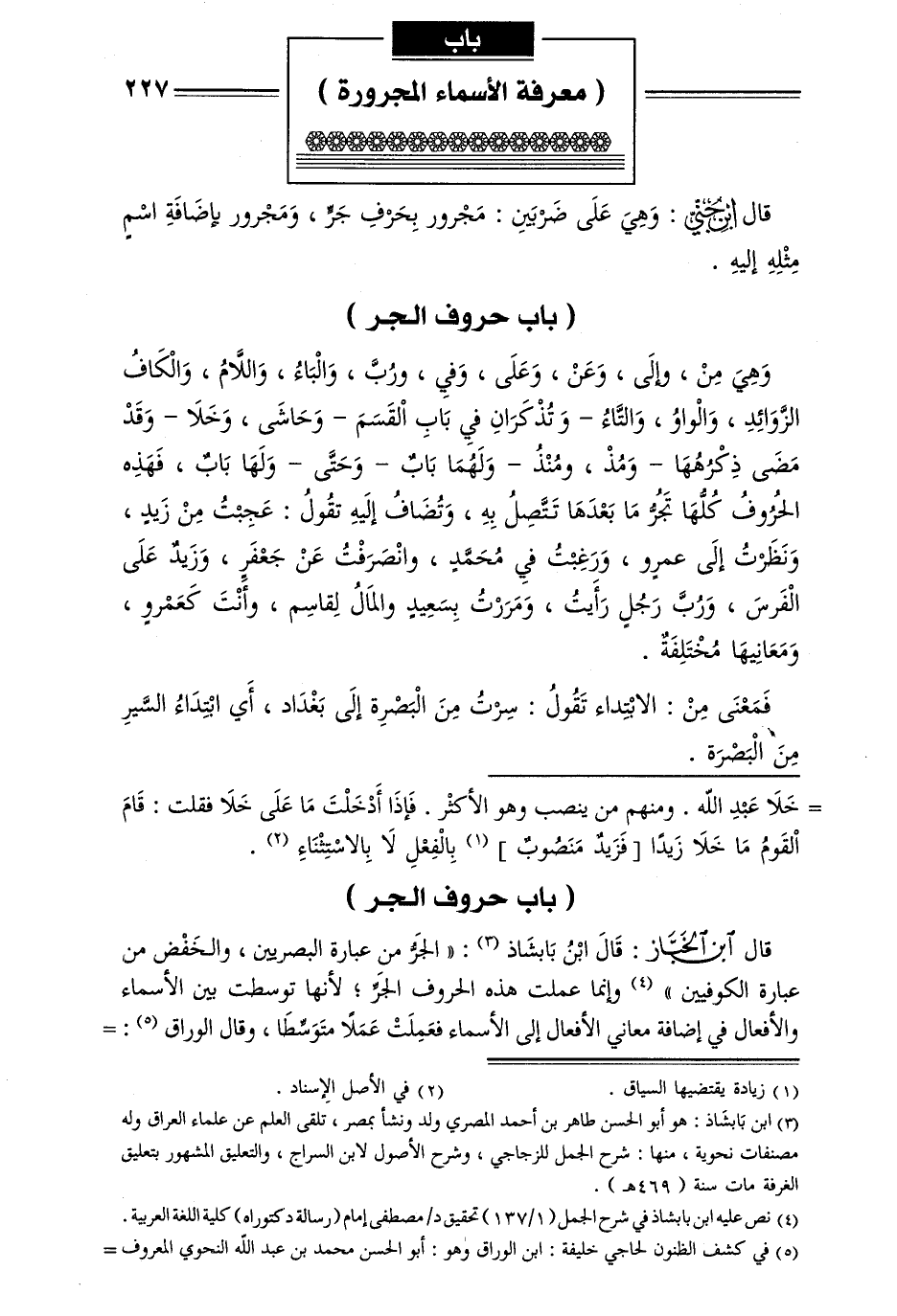 وهي من, وإلى, وعن, وعلى, وفي, ورب, والباء, واللام, والكاف الزوائد, والواو, والتاء - وتذكران في باب القسم - وحاشى, وخلا - وقد مضى ذكرها - ومذ, ومنذ - ولهما باب - وحتى - ولها باب, فهذه الحروف كلها تجر ما بعدها تتصل به, وتضاف إليه تقول: عجبت من زيد, ونظرت إلى عمرو, ورغبت في محمد, وانصرفت عن جعفر, وزيد على الفرس, ورب رجل رأيت, ومررت بسعيد والمال لقاسم, وأنت كعمرو, ومعانيها مختلفة.