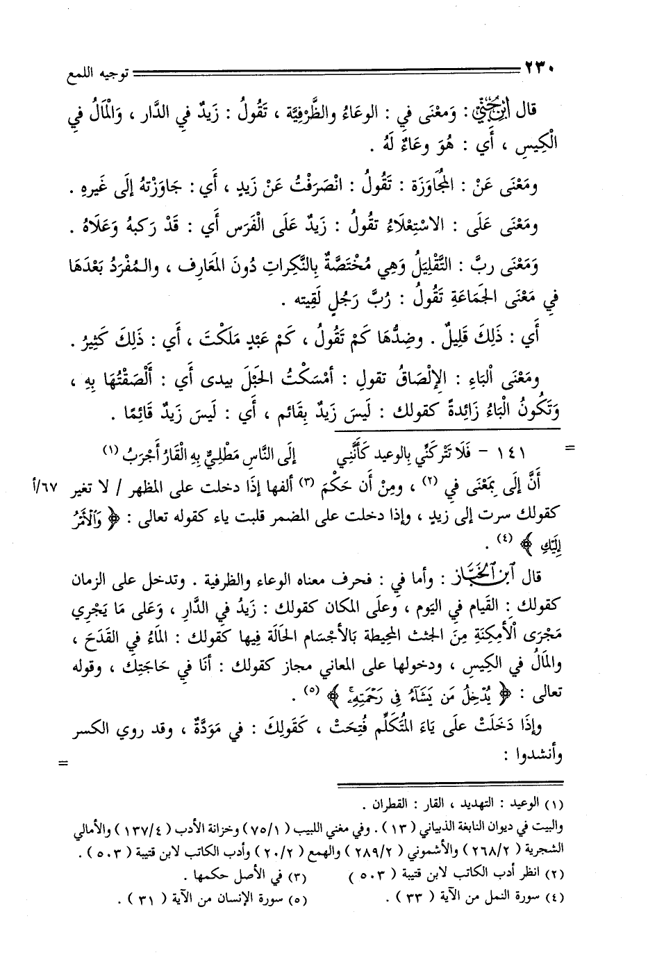 قال ابن جني: ومعنى في: الوعاء والظرفية, تقول: زيد في الدار, والمال في الكيس, أي: هو وعاء له.