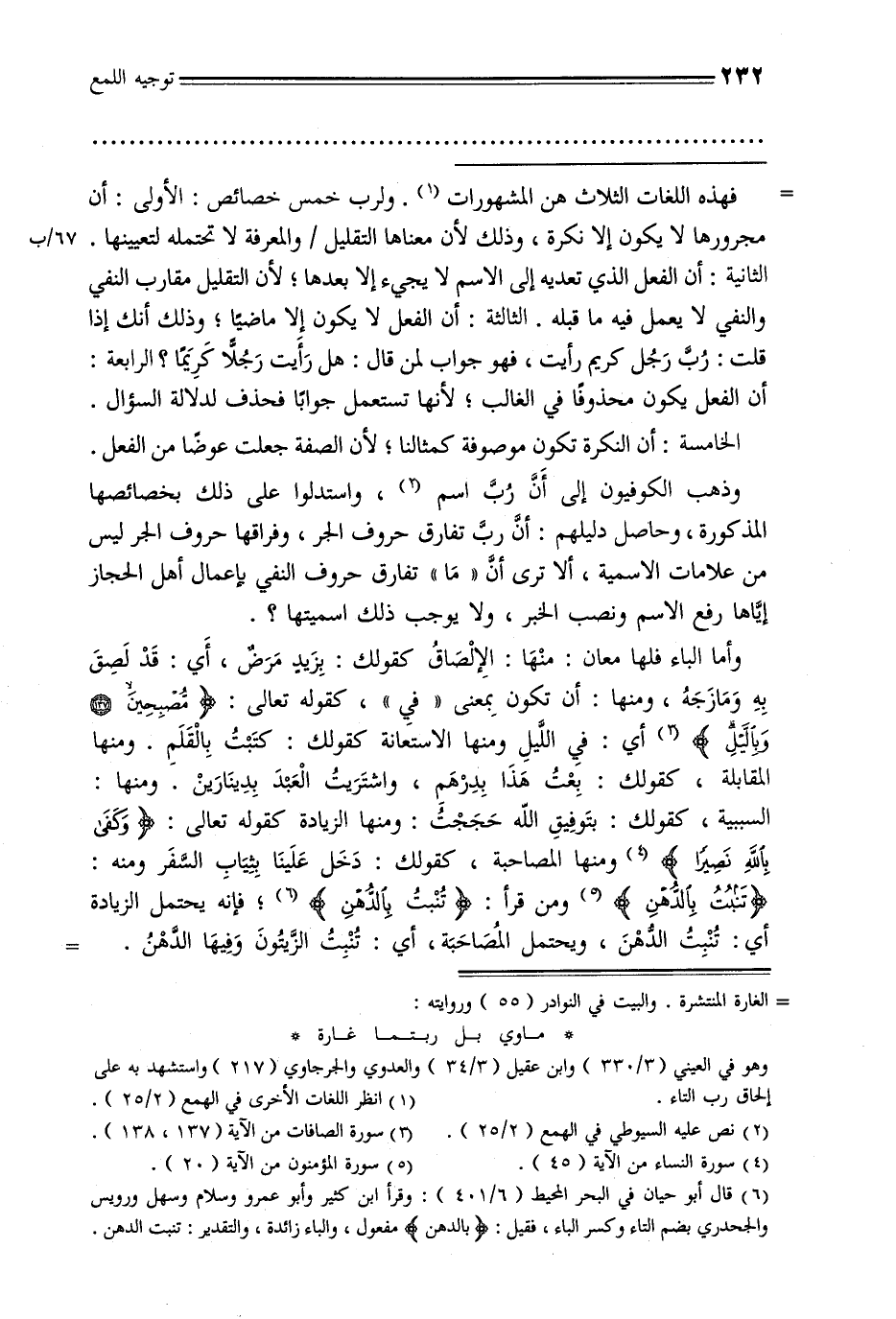 وأما الباء فلها معان: منها: الإلصاق كقولك: بزيد مرض, أي: قد لصق به ومازجه, ومنها: أن تكون بمعنى «في» , كقوله تعالى: {مصبحين * وبالليل} أي: في الليل ومنها الاستعانة كقولك: كتبت بالقلم. ومنها المقابلة, كقولك: بعت هذا بردهم, واشتريت العبد بدينارين. ومنها: السببية, كقولك: بتوفيق الله حججت: ومنها الزيادة كقوله تعالى: {وكفى بالله نصيرًا} ومنها المصاحبة., كقولك: دخل علينا بثياب السفر ومنه: {تنبت بالدهن} ومن قرأ: {تنبت بالدهن} , فإنه يحتمل الزيادة أي: تنبت الدهن, ويحتمل المصاحبة, أي: تنبت الزيتون وفيها الدهن. =