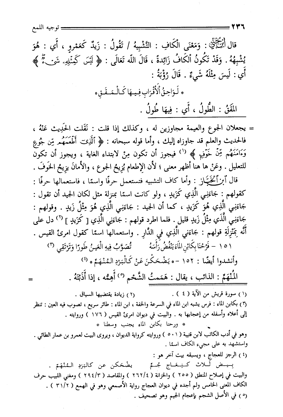 قال ابن جني: ومعنى الكاف: التشبيه / تقول: زيد كعمرو, أي: هو يشبهه. وقد تكون الكاف زائدة, قال الله تعالى: {ليس كمثله شيء} أي: ليس مثله شيء. قال رؤبة: