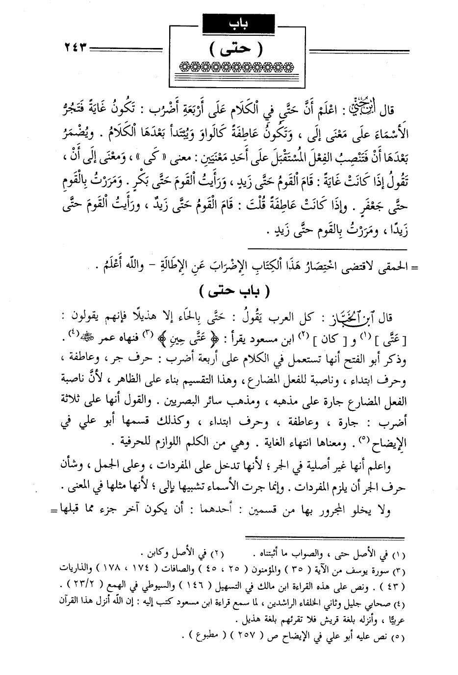 قال ابن الخباز: كل العرب يقول: حتى بالحاء إلا هذيلًا فإنهم يقولون: [عتى] و [كان] ابن مسعود يقرأ: {عتى حين} فنهاه عمر رضي الله عنه. وذكر أبو الفتح أنها تستعمل في الكلام على أربعة أضرب: حرف جر, وعاطفة, وحرف ابتداء, وناصبة للفعل المضارع, وهذا التقسيم بناء على الظاهر, لأن ناصبة الفعل المضارع جارة على مذهبه, ومذهب سائر البصريين. والقول أنها على ثلاثة أضرب: جارة, وعاطفة, وحرف ابتداء, وكذلك قسمها أبو علي في الإيضاح. ومعناها انتهاء الغاية. وهي من الكلم اللوازم للحرفية.