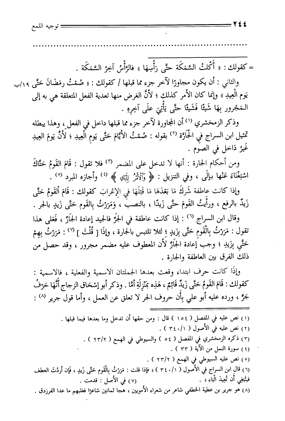وذكر الزمخشري أن المجاورة لآخر جزء مما قبلها داخل في الفعل, وهذا يبطله تمثيل ابن السراج في الجارة بقوله: صمت الأيام حتى يوم العيد, لأن يوم العيد غير داخل في الصوم.