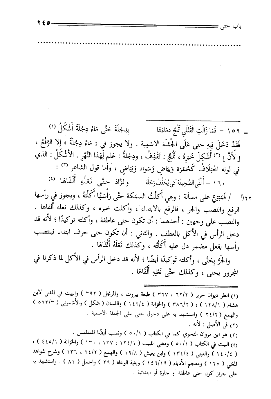 فقد دخل فيه حتى على الجملة الاسمية. ولا يجوز في «ماء دجلة» إلا الرفع, [لأن] أشكل خبره, تمج: تقذف, ودجلة: علم لهذا النهر. الأشكل: الذي في لونه اختلاف كحمرة وبياض وسواد وبياض, وأما قول الشاعر: