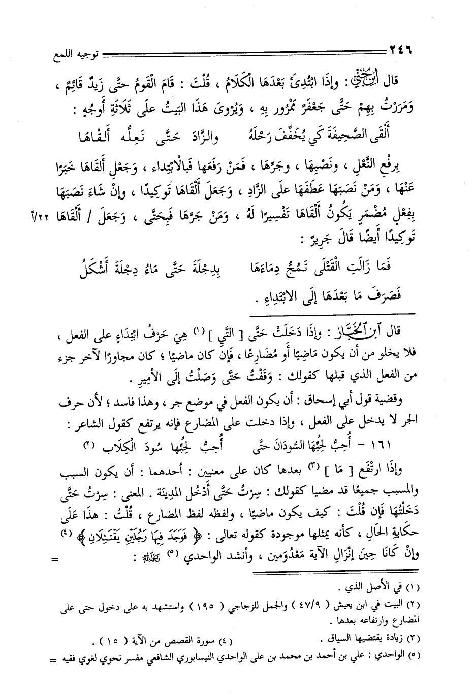 قال ابن جني: وإذا ابتدئ بعدها الكلام, قلت: قام القوم حتى زيد قائم, ومررت بهم حتى جعفر ممرور به, ويروى هذا البيت على ثلاثة أوجه:
