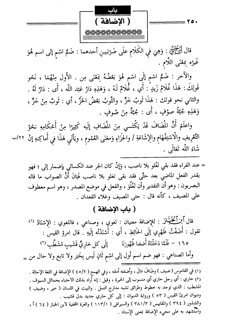 قال ابن الخباز: للإضافة معنيان: لغوي, وصناعي, فاللغوي: الإسناد تقول: أضفت ظهري إلى الحائط, أي: أسندته إليه. قال امرؤ القيس: