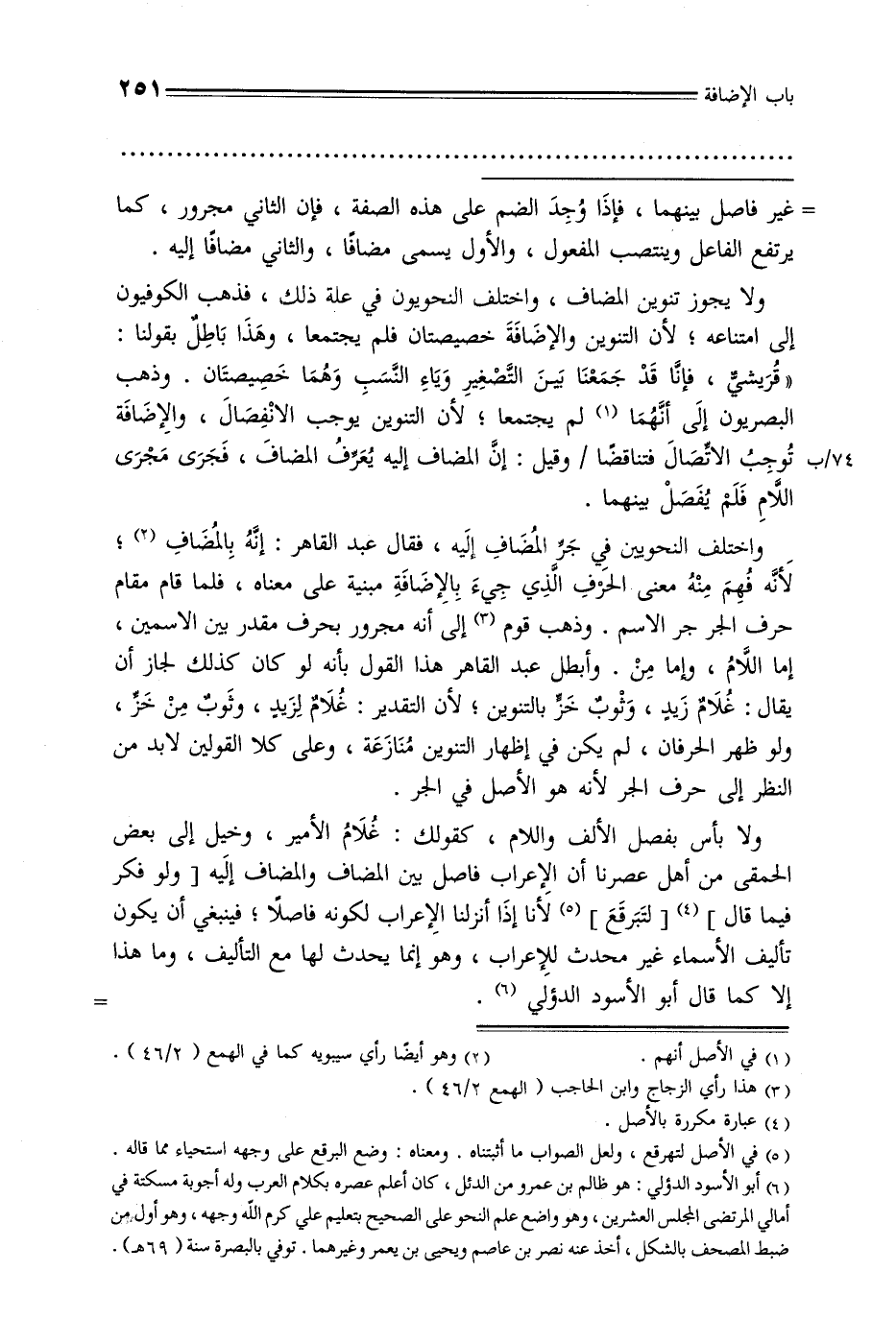 ولا بأس بفصل الألف واللام, كقولك: غلام الأمير, وخيل إلى بعض الحمقى من أهل عصرنا أن الإعراب فاصل بين المضاف والمضاف إليه [ولو فكر فيما قال] [لتبرقع] لأنا إذا أنزلنا الإعراب لكونه فاصلًا, فينبغي أن يكون تأليف الأسماء غير محدث للإعراب, وهو إنما يحدث لها مع التأليف, وما هذا إلا كما قال أبو الأسود الدؤلي.