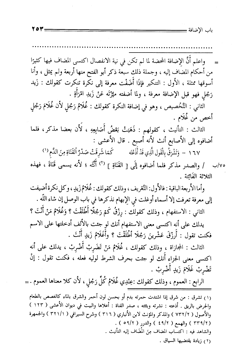 = واعلم أن الإضافة المحضة لما لم تكن في نية الانفصال اكتسى المضاف فيها كثيرًا من أحكام المضاف إليه, وجملة ذلك سبعة ذكر أبو الفتح منها أربعة ولم يمثل, وأنا أسوقها ممثلة, الأول: التنكير فإذا أضفت معرفة إلى نكرة تنكرت كقولكك زيد رجل فهو قبل الإضافة معرفة, ولما أضفته ميزته عن زيد امرأة.