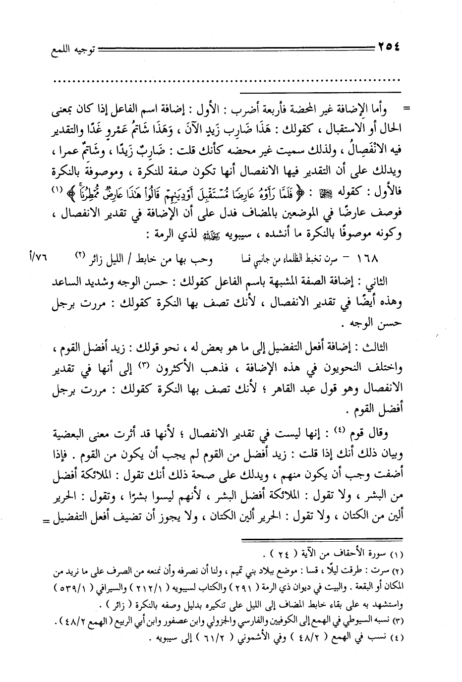 = وأما الإضافة غير المحضة فأربعة أضرب: الأول: إضافة اسم الفاعل إذا كان بمعنى الحال أو الاستقبال, كقولك: هذا ضارب زيد الآن, وهذا شاتم عمرو غدًا والتقدير فيه الانفصال, ولذلك سميت غير محضه كأنك قلت: ضارب زيدًا, وشاتم عمرا, ويدلك على أن التقدير فيها الانفصال أنها تكون صفة للنكرة, وموصوفة بالنكرة فالأول: كقوله عز وجل: {فلما رأوه مستقبل أدويتهم قالوا هذا عارض ممطرنا} فوصف عارضًا في الموضعين بالمضاف فدل على أن الإضافة في تقدير الانفصال, وكونه موصوفًا بالنكرة ما أنشده, سيبويه رحمه الله لذي الرمة: