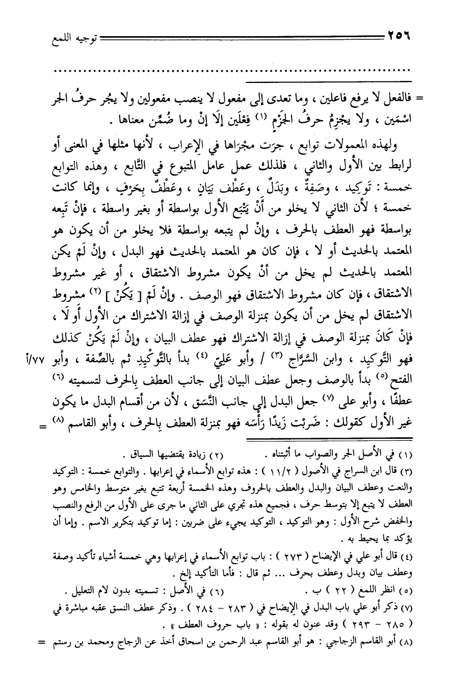 ولهذه المعمولات توابع, جرت مجراها في الإعراب, لأنها مثلها في المعنى أو لرابط بين الأول والثاني, فلذلك عمل عامل المتبوع في التابع, وهذه التوابع خمسة: توكيد, وصفة, وبدل, وعطف بيان, وعطف بحرف, وإنما كانت خمسة, لأن الثاني لا يخلو من أن يتبع الأول بواسطة أو بغير واسطة, فإن تبعه بواسطة فهو العطف بالحرف, وإن لم يتبعه بواسطة فلا يخلو من أن يكون هو المعتمد بالحديث أو لا, فإن كان هو المعتمد بالحديث فهو البدل, وإن لم يكن المعتمد بالحديث لم يخل من أن يكون مشروط الاشتقاق, أو غير مشروط الاشتقاق, فإن كان مشروط الاشتقاق فهو الوصف. وإن لم [يكن] مشروط الاشتقاق لم يخل من أن يكون بمنزلة الوصف في إزالة الاشتراك من الأول أو لا, فإن كان بمنزلة الوصف في إزالة الاشتراك فهو عطف البيان, وإن لم يكن كذلك فهو التوكيد, وابن السراج / وأبو علي بدأ بالتوكيد ثم بالصفة, وأبو 77/ أالفتح بدأ بالوصف وجعل عطف البيان إلى جانب العطف بالحرف لتسميته عطفًا, وأبو على جعل البدل إلى جانب النسق, لأن من أقسام البدل ما يكون غير الأول كقولك: ضربت زيدًا رأسه فهو بمنزلة العطف بالحرف, وأبو القاسم =