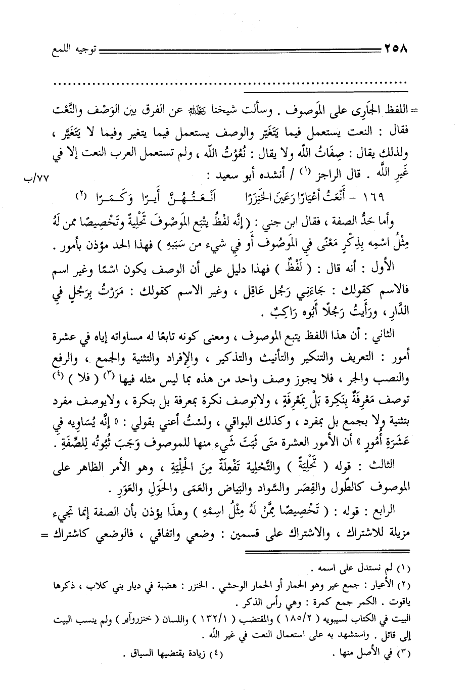 الثاني: أن هذا اللفظ يتبع الموصوف, ومعنى كونه تابعًا له مساواته إياه في عشرة أمور: التعريف والتنكير والتأنيث والتذكير, والإفراد والتثنية والجمع, والرفع والنصب والجر, فلا يجوز وصف واحد من هذه بما ليس مثله فيها (فلا) توصف معرفة بنكرة بل معرفة, ولا توصف نكرة بمعرفة بل نكرة, ولا يوصف مفرد بتثنية ولا يجمع بل بمفرد, وكذلك البواقي, ولست أعني بقولي: «إنه يساويه في عشرة أمور» أن الأمور العشرة متى ثبت شيء منها للموصوف وجب ثبوته للصفة.