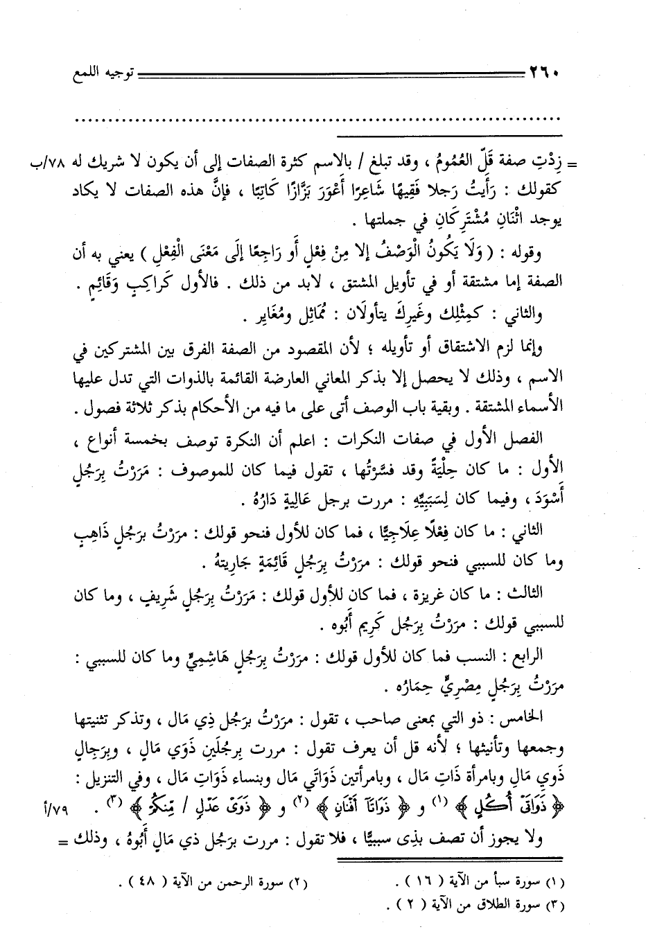 = زدت صفة قل العموم, وقد تبلغ / بالاسم كثرة الصفات إلى أن يكون لا شريك له 78/ب كقولك: رأيت رجلًا فقيهًا شاعرًا أعور بزازًا كاتبًا, فإن هذه الصفات لا يكاد يوجد اثنان مشتركان في جملتها.