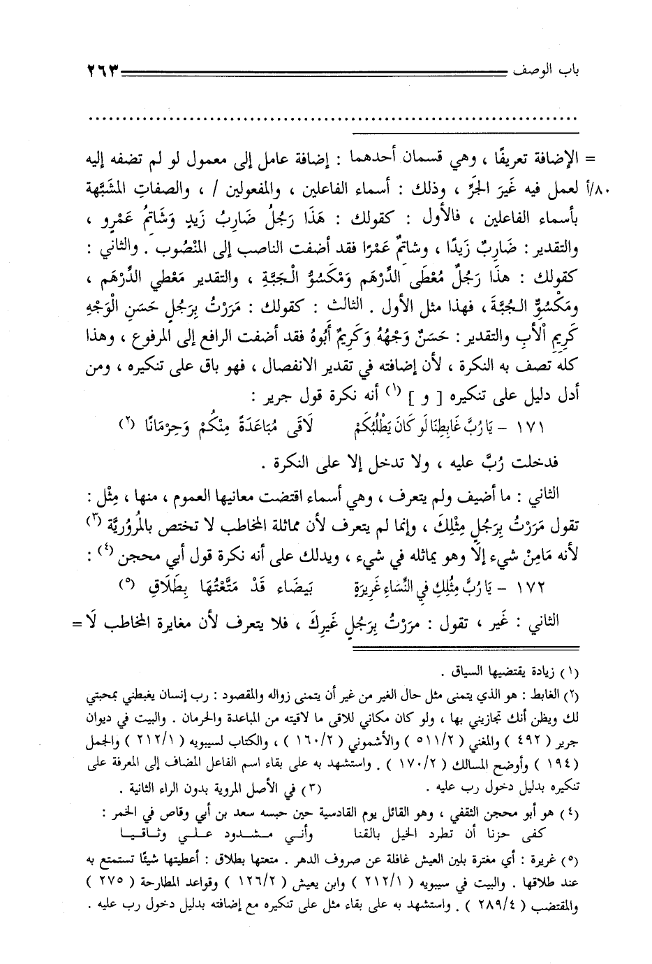 الإضافة تعريفًا, وهي قسمان أحدهما: إضافة عامل إلى معمول لو لم تضفه إليه 80/ألعمل فيه غير الجر, وذلك: أسماء الفاعلين, والمفعولين /, والصفات المشبهة بأسماء الفاعلين, فالأول: كقولك: هذا رجل ضارب زيد وشاتم عمرو, والتقدير: ضارب زيدًا, وشاتم عمرًا فقد أضفت الناصب إلى المنصوب. والثاني: كقولك: هذا رجل معطى الدرهم ومكسو الجبة, والتقدير معطي الدرهم, ومكسور الجبة, فهذا مثل الأول. الثالث: كقولك: مررت برجل حسن الوجه كريم الأب والتقدير: حسن وجهه وكريم أبوه فقد أضفت الرافع إلى المرفوع, وهذا كله تصف به النكرة, لأن إضافته في تقدير الانفصال, فهو باق على تنكيره, ومن أدل دليل على تنكيره [و] أنه نكرة قول جرير: