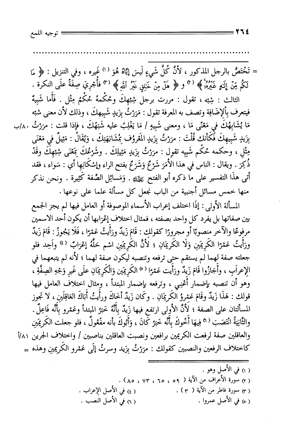الثالث: شبه, تقول: مررت برجل شبهك وحكمه حكم مثل. فأما شبيه فيتعرف بالإضافة وتصف به المعرفة تقول: مررت بزيد شبيهك, وذلك لأن معنى شبه ما يشابهك في معنى ما, ومعنى شبيه / ما يغلب عليه شبهك, فإذا قلت: مررت 80/ب بزيد شبيهك فكأنك قلت: مررت بزيد المعروف بمشابهتك, ويقال: مثيل في معنى مثل, وحكمه حكم شبيه تقول: مررت بزيد مثلك. وشرعك بمعنى شبهك وقد ذكر. ويقال: الناس في هذا الأمر شرع وشرع بفتح الراء وإسكانها أي: سواء, فقد أتى هذا التفسير على ما ذكره أبو الفتح رحمه الله. ومسائل الصفة كثيرة. ونحن نذكر منها خمس مسائل أجنبية من الباب نجعل كل مسألة علما على نوعها.
