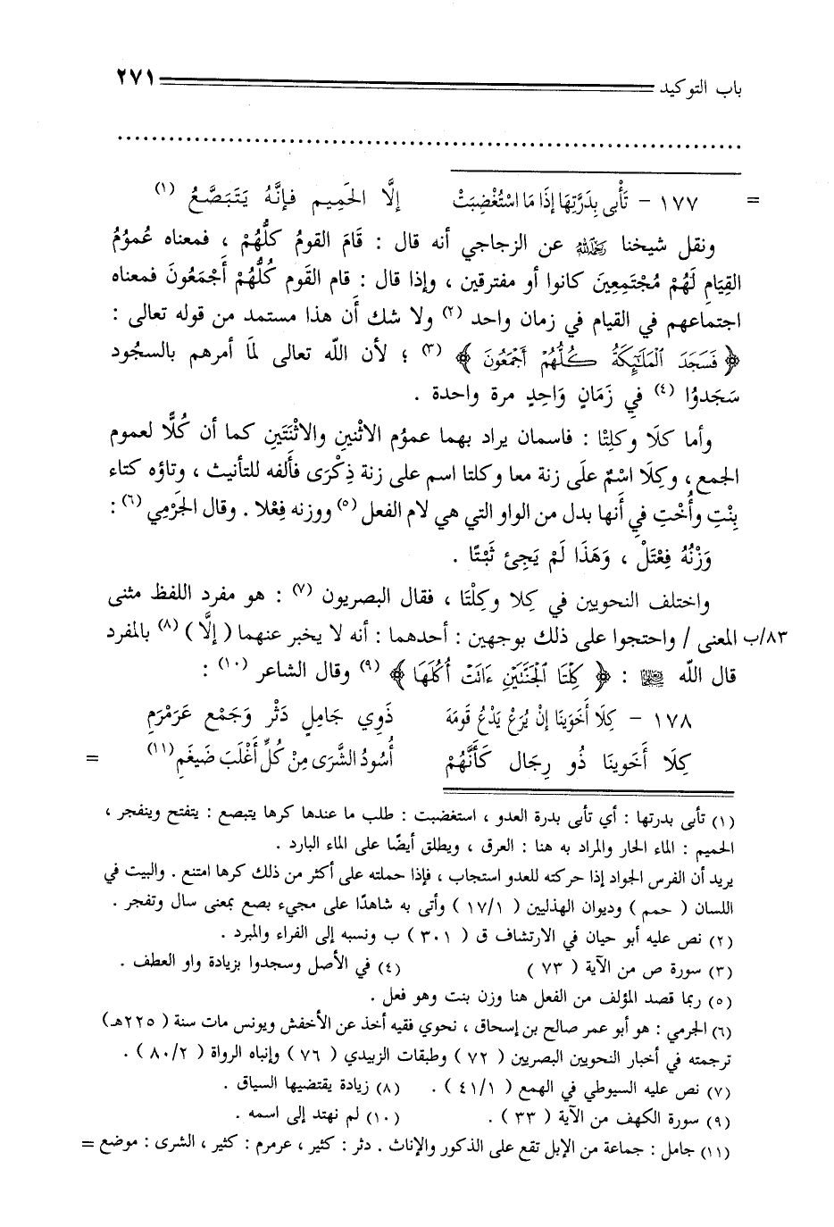 واختلف النحويين في كلا وكلتا, فقال البصريون: هو مفرد اللفظ مثنى 83/ب المعنى / واحتجوا على ذلك بوجهين: أحدهما: أنه لا يخبر عنهما (إلا) بالمفرد قال الله عز وجل: {كلتا الجنتين آتت أكلها} وقال الشاعر: