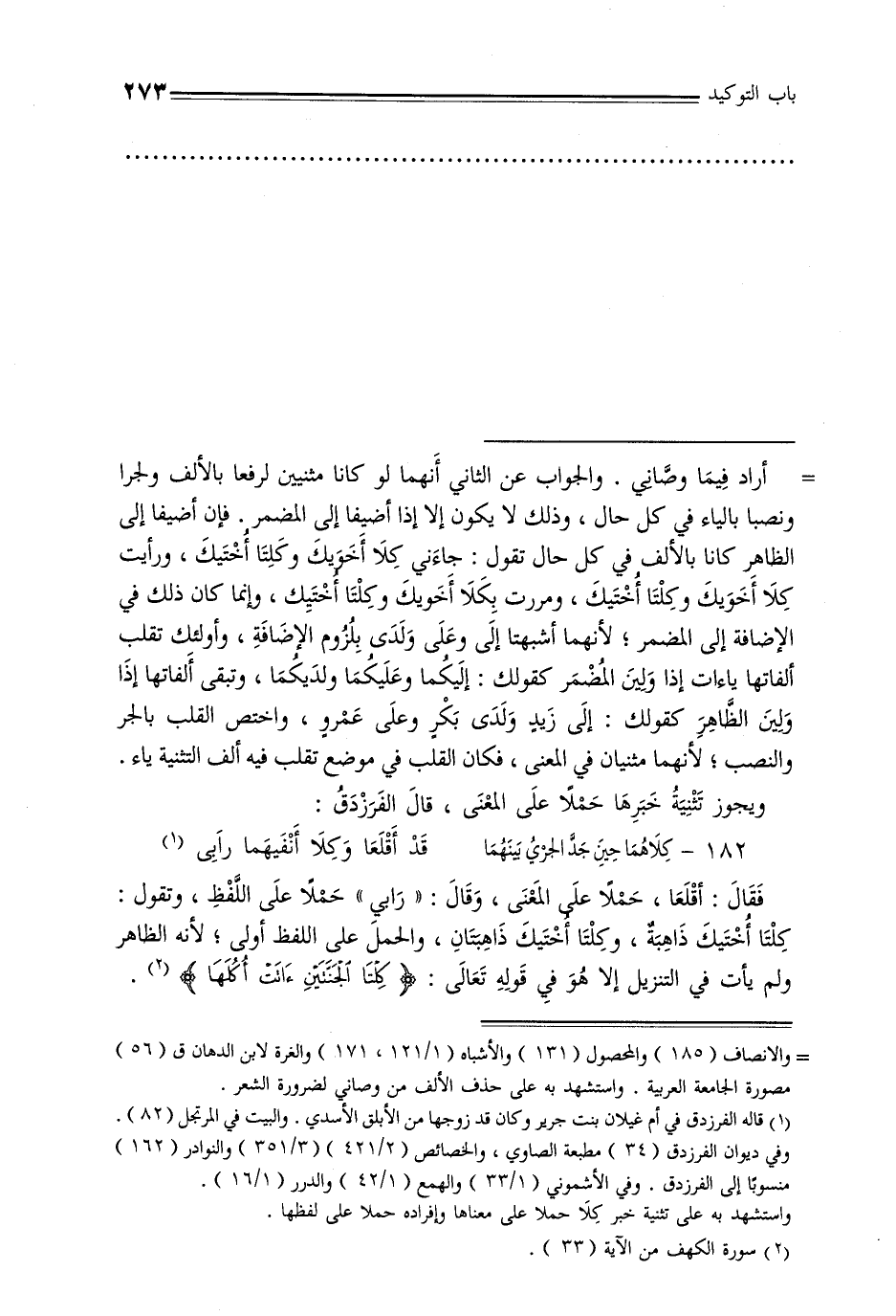 = أراد فيما وصاني. والجواب عن الثاني أنهما لو كانا مثنيين لرفعا بالألف ولجرا ونصبا بالياء في كل حال, وذلك لا يكون إلا إذا أضيفا إلى المضمر. فإن أضيفا إلى الظاهر كانا بالألف في كل حال تقول: جاءني كلا أخويك وكلتا أختيك, ورأيت كلا أخويك وكلتا أختيك, ومررت بكلا أخويك وكلتا أختيك, وإنما كان ذلك في الإضافة إلى المضر, لأنهما أشبهتا إلى وعلى ولدى بلزوم الإضافة, وأولئك تقلب ألفاتها ياءات إذا ولين المضمر كقولك: إليكما وعليكما ولديكم, وتبقى ألفاتها إذا ولين الظاهر كقولك: إلى زيد ولدى بكر وعلى عمرو, واختص القلب بالجر والنصب, لأنهما مثنيان في المعنى, فكان القلب في موضع تقلب فيه ألف التثنية ياء. ويجوز تثنية خبرها حملًا على المعنى, قال الفرزدق: