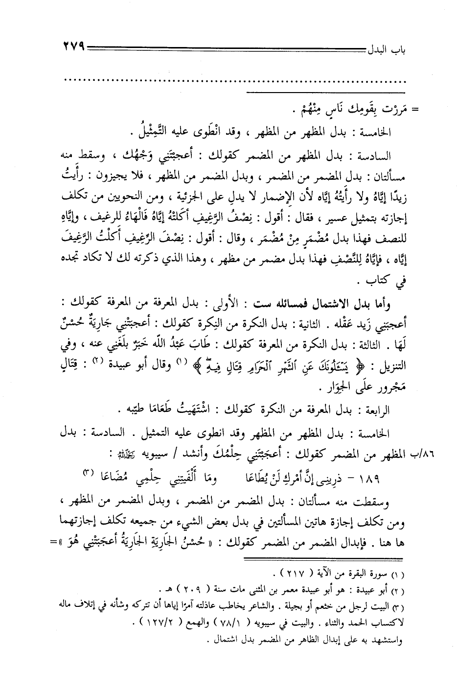 وأما بدل الاشتمال فمسائله ست: الأولى: بدل المعرفة من المعرفة كقولك: أعجبني زيد عقله. الثانية: بدل النكرة من النكرة كقولك: أعجبني جارية حسن لها, الثالثة: بدل النكرة من المعرفة كقولك: طاب عبد الله خبر بلغني عنه, وفي التنزيل: {يسألونك عن الشهر الحرام قتال فيه} وقال أبو عبيدة: قتال مجرور على الجوار.