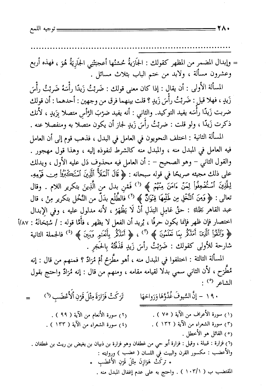المسألة الثالثة: اختلفوا في المبدل منه, أهو مطرح أم مراد؟ فمنهم من قال: إنه مطرح, لأن الثاني سمي بدلا لقيامه مقامه, ومنهم من قال: إنه مراد واحتج بقول الشاعر: