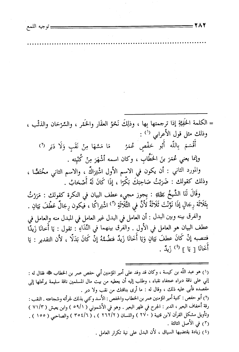 وقال لنا الشيخ رحمه الله: يجوز مجيء عطف البيان في النكرة كقولك: مررت بثلاثة رجال إذا نونت ثلاثة لأن في الثلاثة اشتراكا, فيكون رجال عطف بيان. والفرق بينه وبين البدل: أن العامل في البدل غير العامل في المبدل منه والعامل في عطف البيان هو العامل في الأول. والفرق بينهما في النداء: تقول: يا أخانا زيدًا فتنصبه إن كان عطف بيان ويا أخانا زيد فتضمه إن كان بدلًا, لأن التقدير: يا أخانا [يا] زيد.