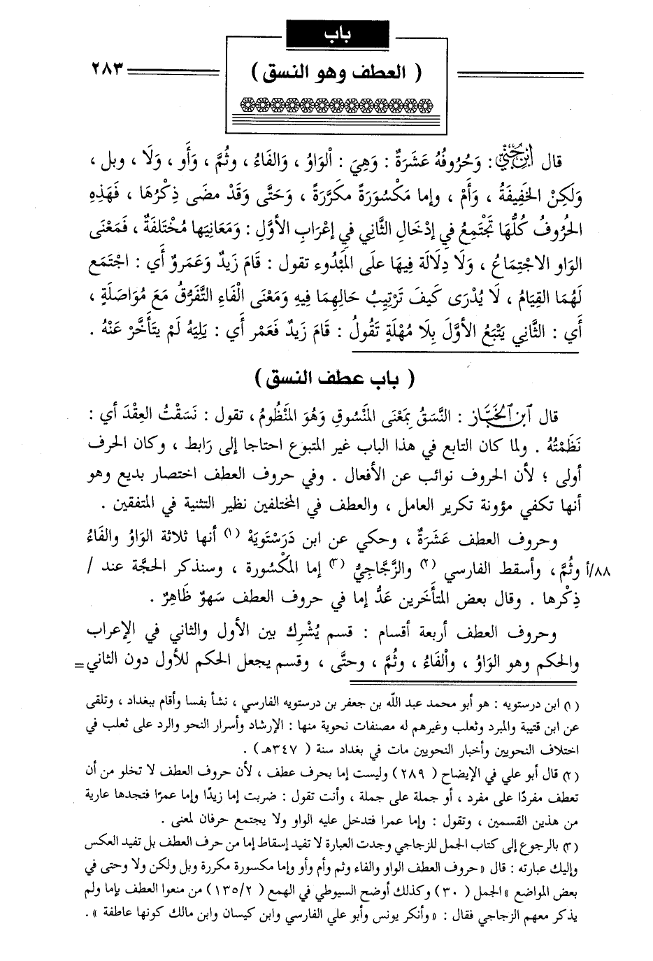 قال ابن جني: وحروفه عشرة: وهي: الواو, والفاء, وثم, وأو, ولا, وبل, ولكن الخفيفة, وأم, وإما مكسورة مكررة, وحتى وقد مضى ذكرها, فهذه الحروف كلها تجتمع في إدخال الثاني في إعراب الأول: ومعانيها مختلفة, فمعنى الواو الاجتماع, ولا دلالة فيها على المبدوء تقول: قام زيد وعمرو أي: اجتمع لهما القيام, لا يدرى كيف ترتيب حالهما فيه ومعنى الفاء التفرق مع مواصلة, أي: الثاني يتبع الأول بلا مهلة تقول: قام زيد فعمر أي: يليه لم يتأخر عنه.