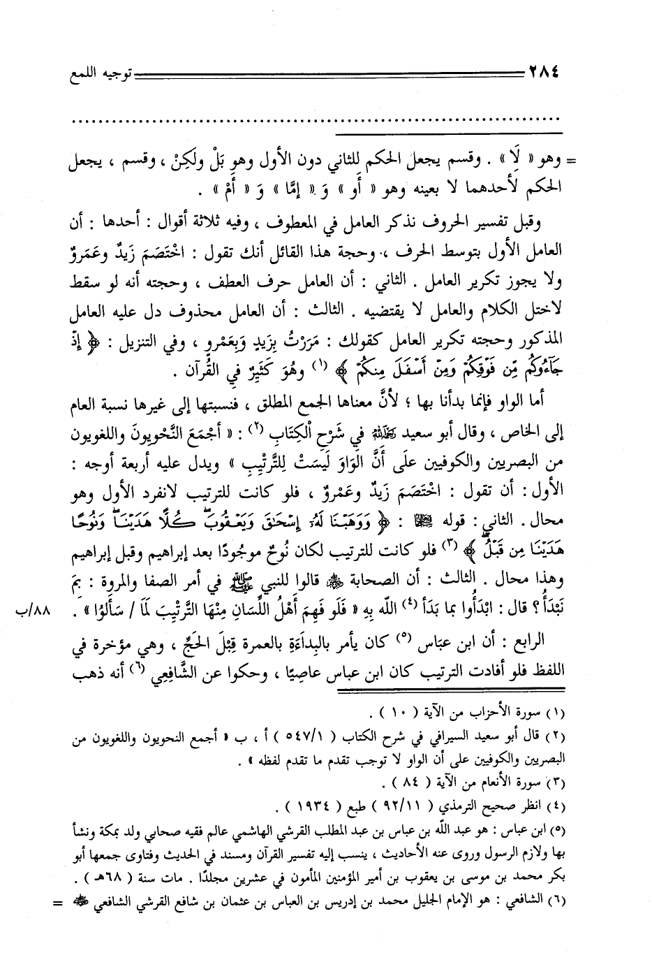 أما الواو فإنما بدأنا بها, لأن معناها الجمع المطلق, فنسبتها إلى غيرها نسبة العام إلى الخاص, وقال أبو سعيد رحمه الله في شرح الكتاب: «أجمع النحويون واللغويون من البصريين والكوفيين على أن الواو ليست للترتيب» ويدل عليه أربعة أوجه: الأول: أن تقول: اختصم زيد وعمرو, فلو كانت للترتيب لانفرد الأول وهو محال. الثاني قوله عز وجل: {ووهبنا له إسحاق ويعقوب كلًا هدينا ونوحًا هدينا من قبل} فلو كانت للترتيب لكان نوح موجودًا بعد إبراهيم وقبل إبراهيم وهذا محال. الثالث: أن الصحابة رضي الله عنهم قالوا للنبي صلى الله عليه وسلم في أمر الصفا والمروة: بم نبدأ؟ قال: ابدأوا بما بدأ الله به «فلو فهم أهل اللسان منها الترتيب لما / سألوا».