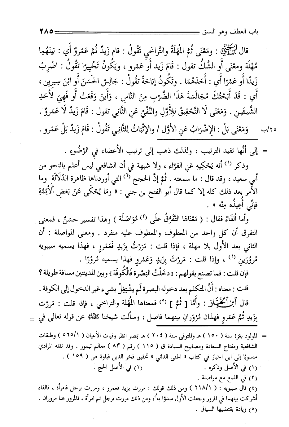 قال ابن الخباز: وأما [ثم] فمعناها المهلة والتراخي, فإذا قلت: مررت بزيد ثم عمر فهذا مروران بينهما فاصل, وسألت شيخنا رحمه الله عن قوله تعالى في =