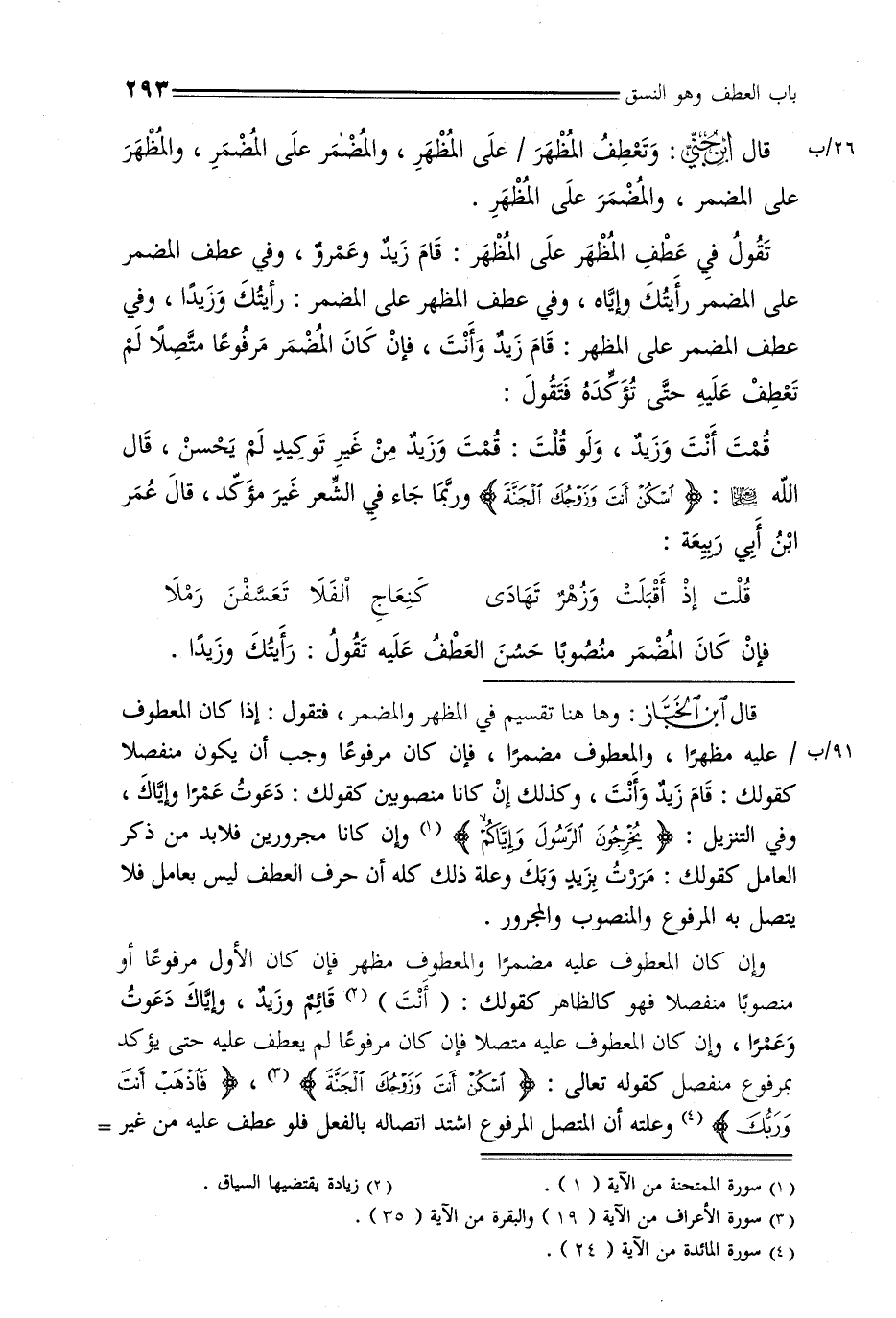 وإن كان المعطوف عليه مضمرًا والمعطوف مظهر فإن كان الأول مرفوعًا أو منصوبًا منفصلًا فهو كالظاهر كقولك: (أنت) قائم وزيد, وإياك دعوت وعمرًا, وإن كان المعطوف عليه متصلا فإن كان مرفوعًا لم يعطف عليه حتى يؤكد بمرفوع منفصل كقوله تعالى: {أسكن أنت وزوجك الجنة} , {فاذهب أنت وربك} وعلته أن المتصل المرفوع اشتد اتصاله بالفعل فلو عطف عليه من غير =