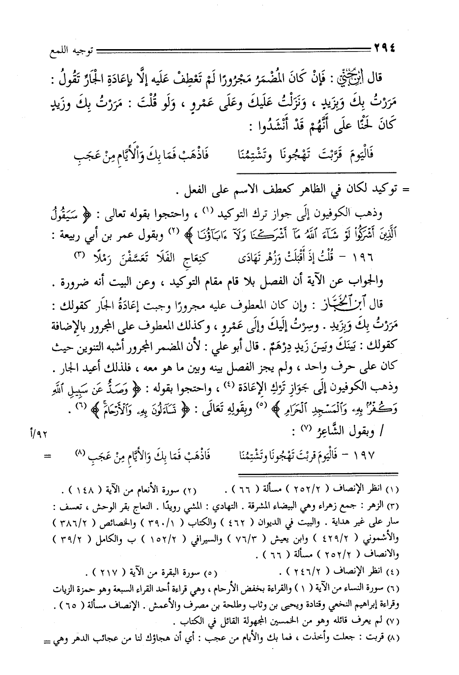 قال ابن الخباز: وإن كان المعطوف عليه مجرورًا وجبت إعادة الجار كقولك: مررت بك وبزيد. وسرت إليك وإلى عمرو, وكذلك المعطوف على المجرور بالإضافة كقولك: بينك وبين زيد درهم. قال أبو علي: لأن المضمر المجرور أشبه التنوين حيث كان على حرف واحد, ولم يجز الفصل بينه وبين ما هو معه, فلذلك أعيد الجار. وذهب الكوفيون إلى جواز ترك الإعادة, واحتجوا بقوله: {وصد عن سبيل الله وكفروا به والمسجد الحرام} وبقوله تعالى: {تساءلون به والأرحام}.