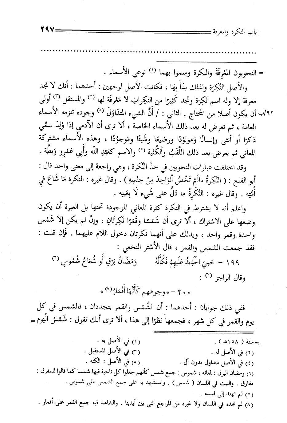واعلم أنه لا يشترط في النكرة كثرة المعاني الموجودة تحتها بل العبرة أن يكون وضعها على الاشتراك, ألا ترى أن شمسًا وقمرًا نكرتان, وإن لم يكن إلا شمس واحدة وقمر واحد, ويدلك على أنهما نكرتان دخول اللام عليهما. فإن قلت: فقد جمعت الشمس والقمر, قال الأشتر النخعي: