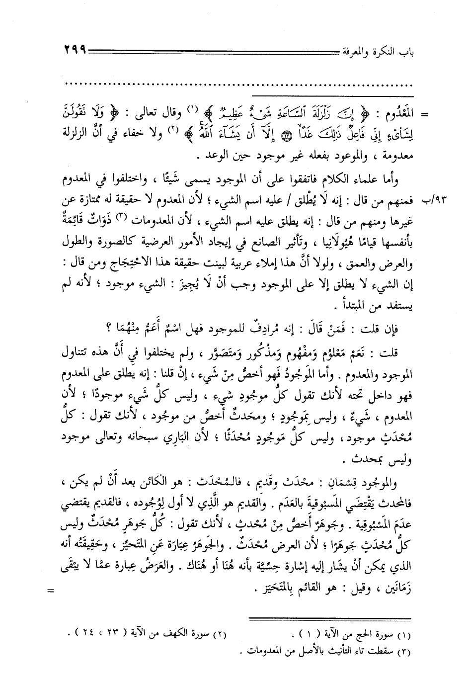 = المعدوم: {إن زلزلة الساعة شيء عظيم} وقال تعالى: {ولا تقولن لشيء إني فاعل ذلك غدا * إلا أن يشاء الله} ولا خفاء في أن الزلزلة معدومة, والموعود بفعله غير موجود حين الوعد.