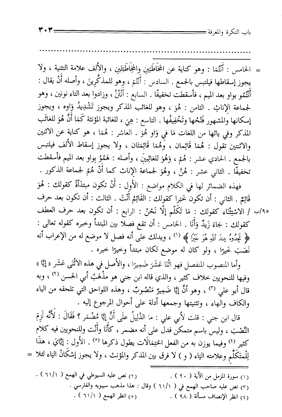 قال ابن جني: قلت لأبي علي: ما الدليل على أن إيا مضمر؟ فقال: لأنه لزم النصب, وليس باسم متمكن فدل على أنه مضمر, كأن وأنت وللنحويين فيه كلام كثير وفيما يوزن به من الفعل احتمالات يطول ذكرها. الأول: إياي, هذا للمتكلم وعلامته الياء (و) لا فرق بين المذكر والمؤنث, ولا يجوز إشكال الياء لئلا =