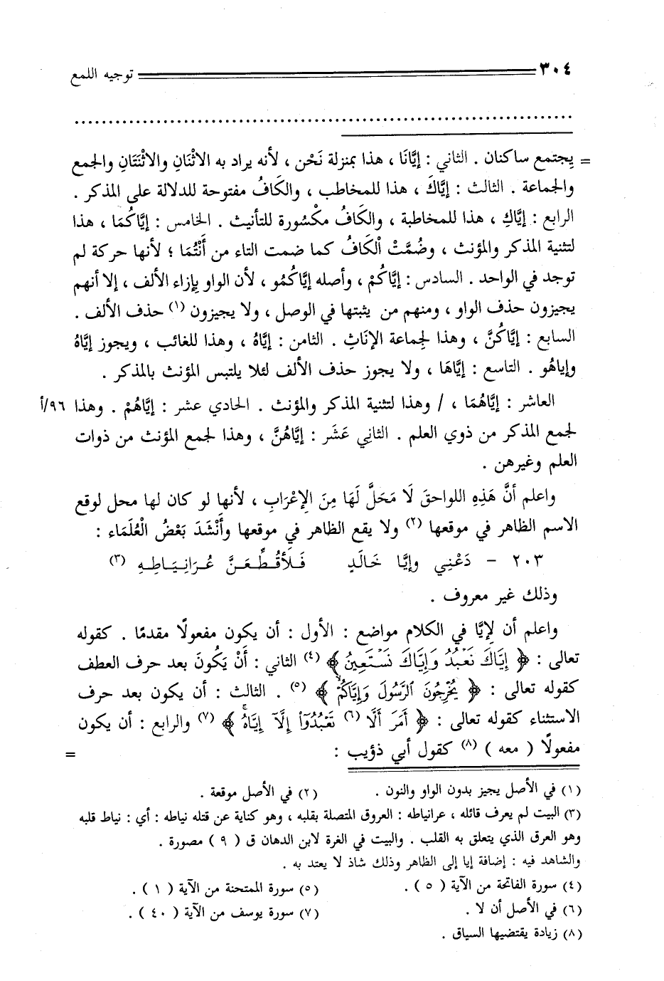واعلم أن لإيا في الكلام مواضع: الأول: أن يكون مفعولًا مقدمًا. كقوله تعالى: {إياك نعبد وإياك نستعين} الثاني: أن يكون بعد حرف العطف كقوله تعالى: {يخرجون الرسول وإياكم}. الثالث: أن يكون بعد حرف الاستثناء كقوله تعالى: {أمر ألا تعبدوا إلا إياه} والرابع: أن يكون مفعولًا (معه) كقول أبي ذويب: