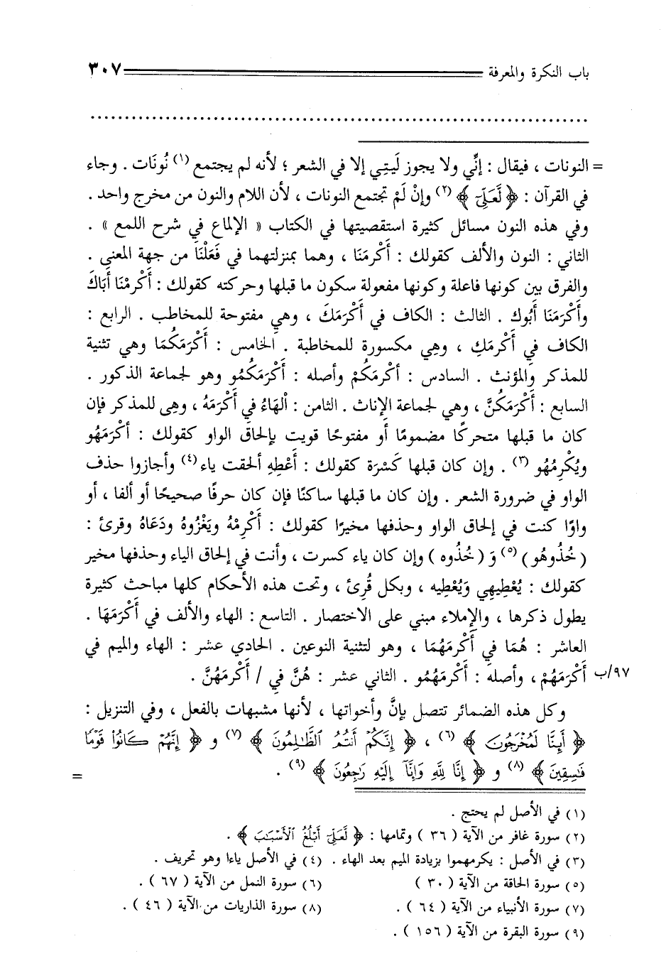 = النونات, فيقال: إني ولا يجوز ليتي إلا في الشعر, لأنه لم يجتمع نونات. وجاء في القرآن: {لعلي} وإن لم تجتمع النونات, لأن اللام والنون من مخرج واحد. وفي هذه النون مسائل كثيرة استقصيتها في الكتاب «الإلماع في شرح اللمع». الثاني: النون والألف كقولك: أكرمنا, وهما بمنزلتهما في فعلنا من جهة المعنى. والفرق بين كونها فاعلة وكونها مفعولة سكون ما قبلها وحركته كقولك: أكرمنا أباك وأكرمنا أبوك. الثالث: الكاف في أكرمك, وهي مفتوحة للمخاطب. الرابع: الكاف في أكرمك, وهي مكسورة للمخاطبة. الخامس: أكرمكما وهي تثنية للمذكر والمؤنث. السادس: أكرمكم وأصله: أكرمكمو وهو لجماعة الذكور. السابع: أكرمكن, وهي لجماعة الإناث. الثامن: الهاء في أكرمه, وهي للمذكر فإن كان ما قبلها متحركا مضمومًا أو مفتوحًا قويت بإلحاق الواو كقولك: أكرمهو ويكرمهو. وإن كان قبلها كسرة كقولك: أعطه ألحقت ياء وأجازوا حذف الواو في ضرورة الشعر. وإن كان ما قبلها ساكنًا فإن كان حرفًا صحيحًا أو ألفًا, أو واوًا كنت في إلحاق الواو وحذفها مخيرًا كقولك: أكرمه ويغزوه ودعاه وقرئ: (خذوهو) و (خذوه) وإن كان ياء كسرت, وأنت في إلحاق الياء وحذفها مخير كقولك: يعطيهي ويعطيه, وبكل قرئ, وتحت هذه الأحكام كلها مباحث كثيرة يطول ذكرها, والإملاء مبني على الاختصار. التاسع: الهاء والألف في أكرمها. العاشر: هما في أكرمهما, وهو لتثنية النوعين. الحادي عشر: الهاء والميم في أكرمهم, وأصله: أكرمهمو. الثاني عشر: هن في / أكرمهن.