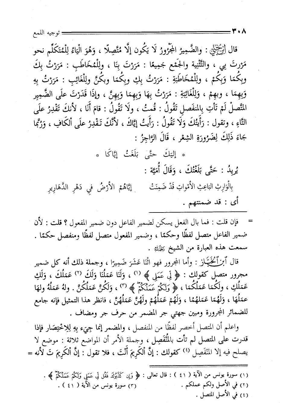 قال ابن جني: والضمير المجرور لا يكون إلا متصلًا, وهو الياء للمتكلم نحو مررت بي, والتثنية والجمع جميعًا: مررت بنا, وللمخاطب: مررت بك وبكما وبكم, وللمخاطبة: مررت بك وبكما وبكن وللغائب: مررت به وبهما, وبهم, وللغائبة: مررت بها وبهما وبهن, وإذا قدرت على الضمير المتصل لم تأت بالمنفصل تقول: قمت, ولا تقول: قام أنا, لأنك تقدر على التاء, وتقول: رأيتك ولا تقول: رأيت إياك, لأنك تقدر على الكاف, وربما جاء ذلك لضرورة الشعر, قال الراجز: