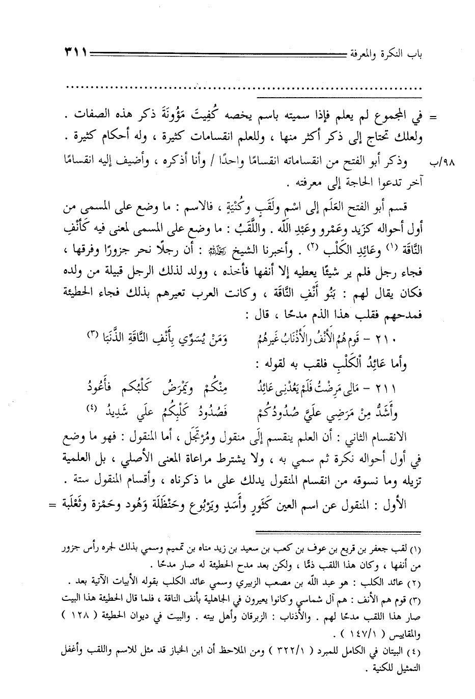 قسم أبو الفتح العلم إلى اسم ولقب وكنية, فالاسم: ما وضع على المسمى من أول أحواله كزيد وعمرو وعبد الله. واللقب: ما وضع على المسمى لمعنى فيه كأنف الناقة وعائد الكلب. وأخبرنا الشيخ رحمه الله: أن رجلًا نحر جزورًا وفرقها, فجاء رجل فلم ير شيئًا يعطيه إلا أنفها فأخذه, وولد لذلك الرجل قبيلة من ولده فكان يقال لهم: بنو أنف الناقة, وكانت العرب تعيرهم بذلك فجاء الحطيئة فمدحهم فقلب هذا الذم مدحًا, قال:
