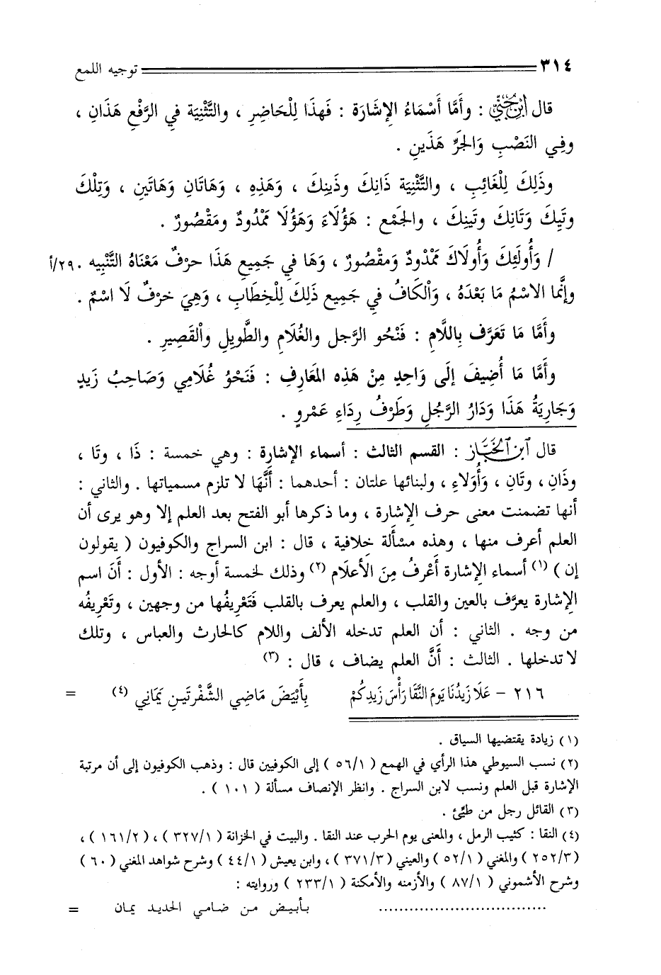 قال ابن جني: وما أسماء الإشارة: فهذا للحاضر, والتثنية في الرفع هذان, وفي النصب والجر هذين.