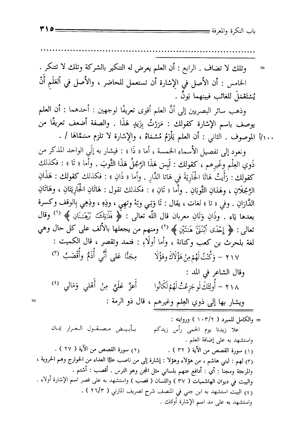 ونعود إلى تفصيل الأسماء الخمسة, أما «ذا»: فيشار به إلى الواحد المذكر من ذوي العلم وغيرهم, كقولك: لبس هذا الرجل هذا الثوب. وأما «تا»: فكذلك كقولك: رأيت هاتا الجارية في هاتا الدار. وأما «ذان»: فكذلك كقولك: هذان الرجلان, وهذان الثوبان. وأما «تان»: فكذلك تقول: هاتان الجاريتان, وهاتان الداران. وذان وتان معربان قال الله تعالى: {فذلك برهان} وقال تعالى: {إحدى ابنتي هاتين} ومنهم من يجعل الألف على كل حال وهي لغة بلحرث بن كعب وكنانة, وأما أولاء: فتمد وتقصر, قال الكميت: