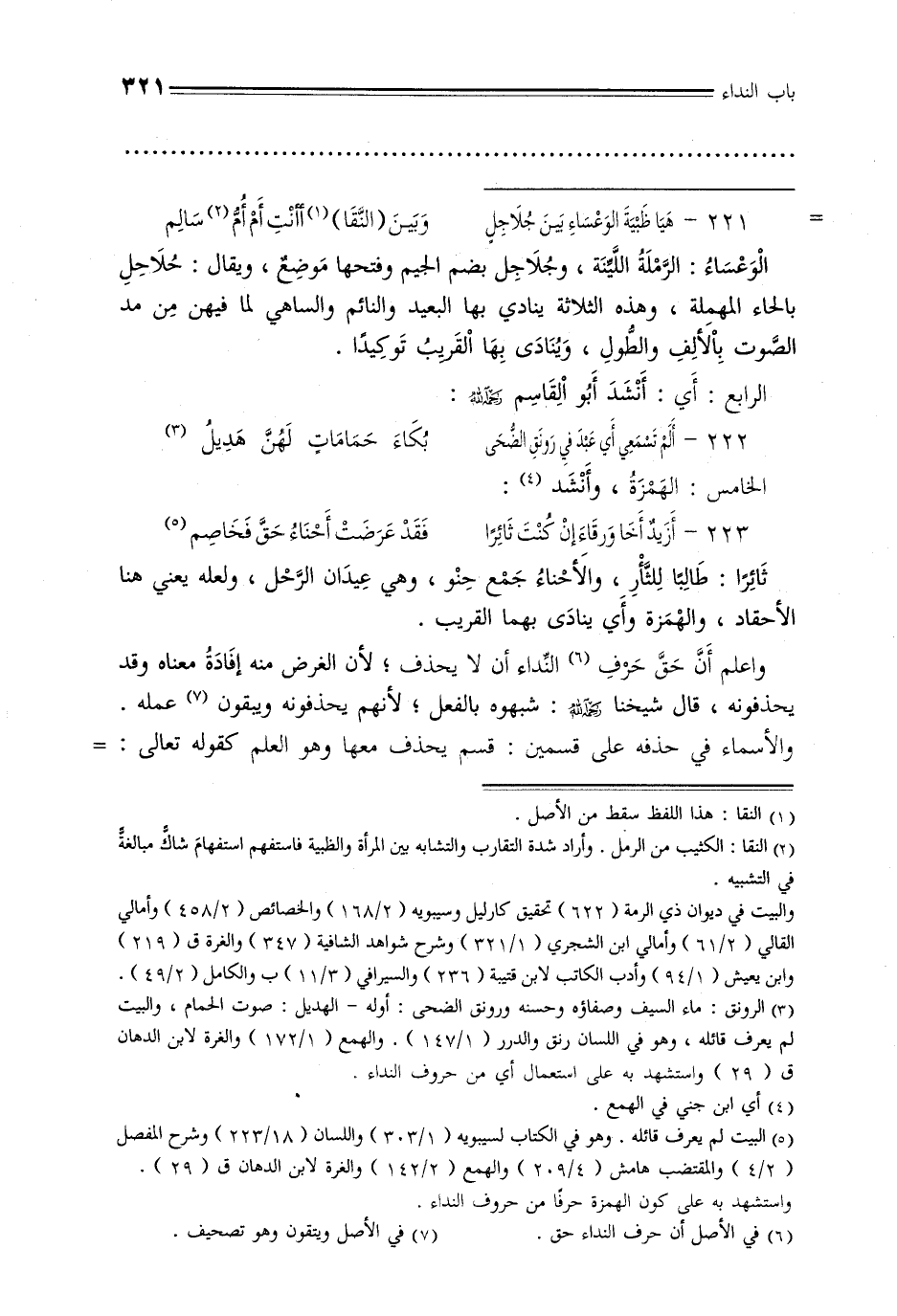 واعلم أن حق حرف النداء أن لا يحذف, لأن الغرض منه إفادة معناه وقد يحذفونه, قال شيخنا رحمه الله: شبهوه بالفعل, لأنهم يحذفونه ويبقون عمله. والأسماء في حذفه على قسمين: قسم يحذف معها وهو العلم كقوله تعالى: =