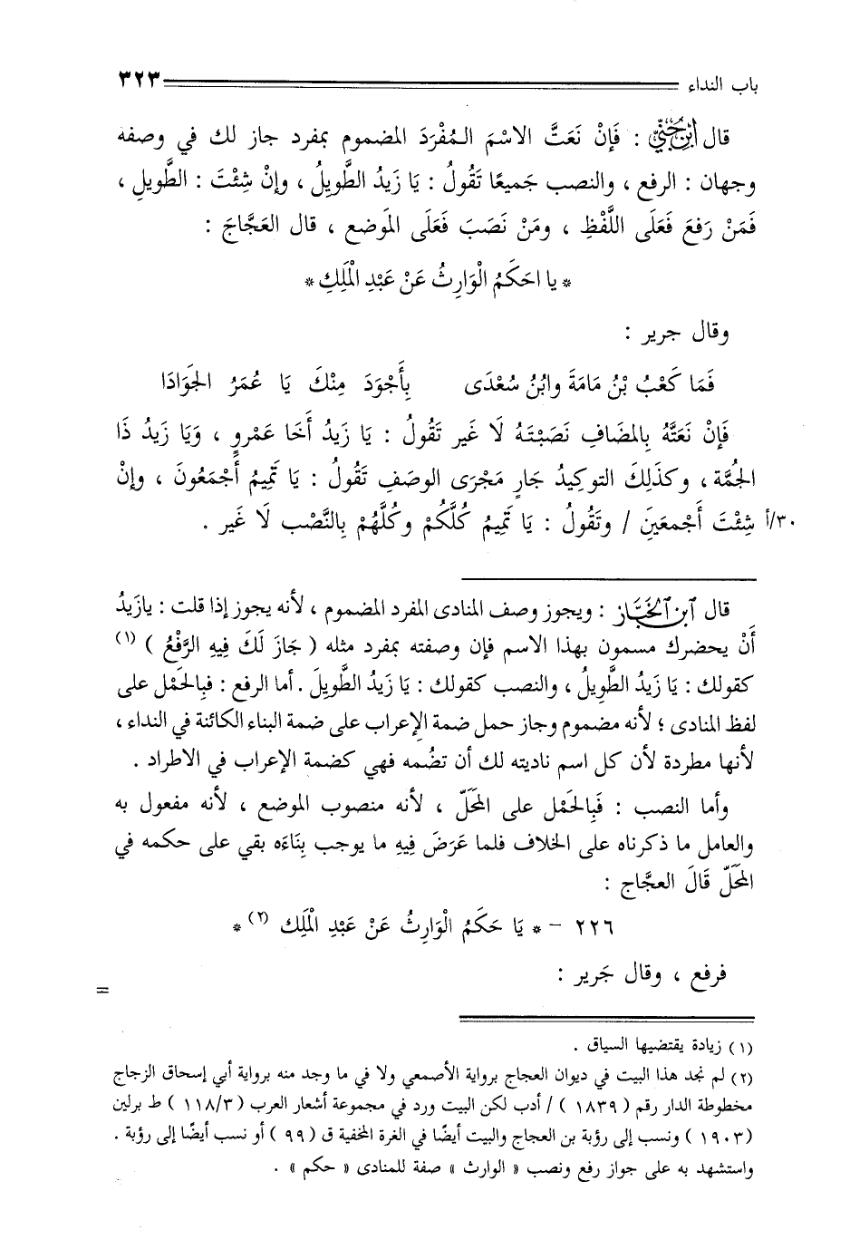 قال ابن الخباز: ويجوز وصف المنادى المفرد المضموم, لأنه يجوز إذا قلت: يا زيد أن يحضرك مسمون بهذا الاسم فإن وصفته بمفرد مثله (جاز لك فيه الرفع) كقولك: يا زيد الطويل, والنصب كقولك: يا زيد الطويل. أما الرفع: فبالحمل على لفظ المنادى, لأنه مضموم وجاز حمل ضمة الإعراب على ضمة البناء الكائنة في النداء, لأنها مطردة لأن كل اسم ناديته لك أن تضمه فهي كضمة الإعراب في الاطراد. وأما النصب: فبالحمل على المحل, لأنه منصوب الموضع, لأنه مفعول به والعامل ما ذكرناه على الخلاف فلما عرض فيه ما يوجب بناءه بقي على حكمه في المحل قال العجاج: