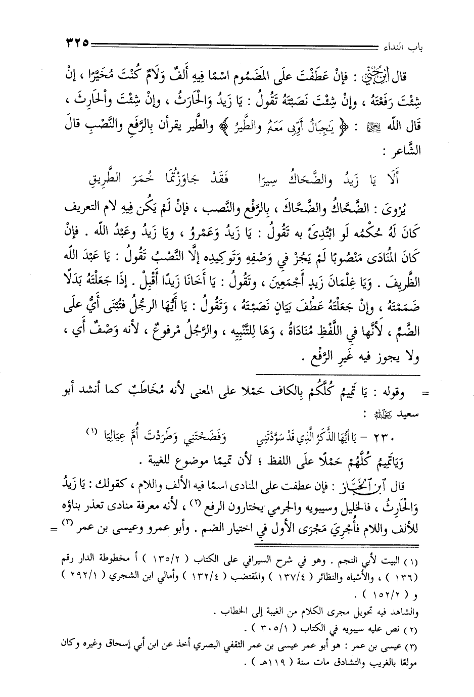 قال ابن الخباز: فإن عطفت على المنادى اسمًا فيه الألف واللام, كقولك: يا زيد والحارث, فالخليل وسيبويه والجرمي يختارون الرفع, لأنه معرفة منادى تعذر بناؤه للألف واللام فأجري مجرى الأول في اختيار الضم. وأبو عمرو وعيسى بن عمر =