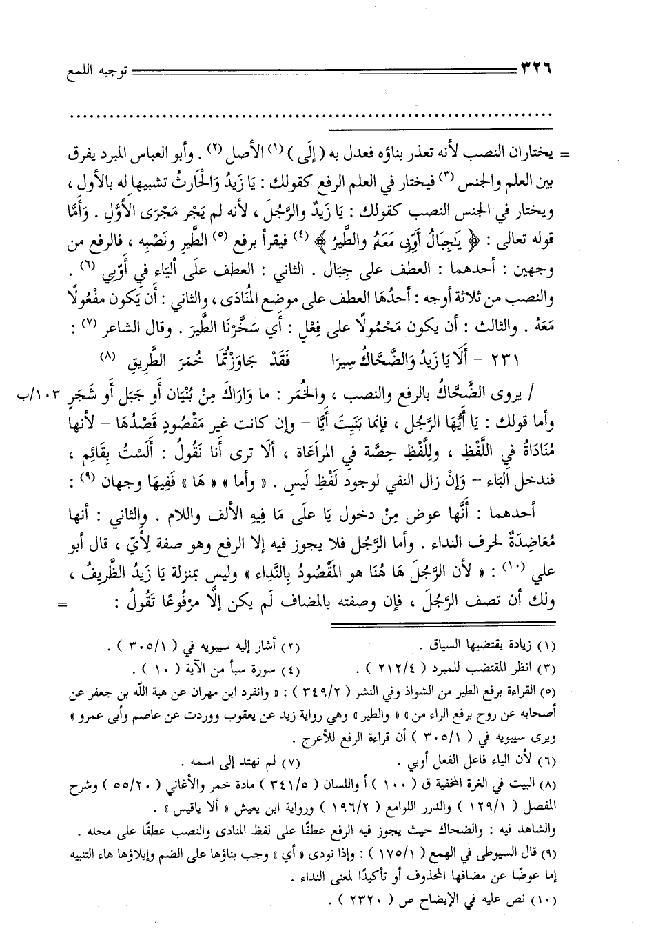= يختاران النصب لأنه تعذر بناؤه فعدل به (إلى) الأصل. وأبو العباس المبرد يفرق بين العلم والجنس فيختار في العلم الرفع كقولك: يا زيد والحارث تشبيهًا له بالأول, ويختار في الجنس النصب كقولك: يا زيد والرجل, لأنه لم يجر مجرى الأول. وأما قوله تعالى: {يا جبال أوبي معه والطير} فيقرأ برفع الطير ونصبه, فالرفع من وجهين: أحدهما: العطف على جبال. الثاني: العطف على الياء في أوبي. والنصب من ثلاثة أوجه: أحدها العطف على موضع المنادى, والثاني: أن يكون مفعولًا معه. والثالث: أن يكون محمولًا على فعل: أي سخرنا الطير. وقال الشاعر: