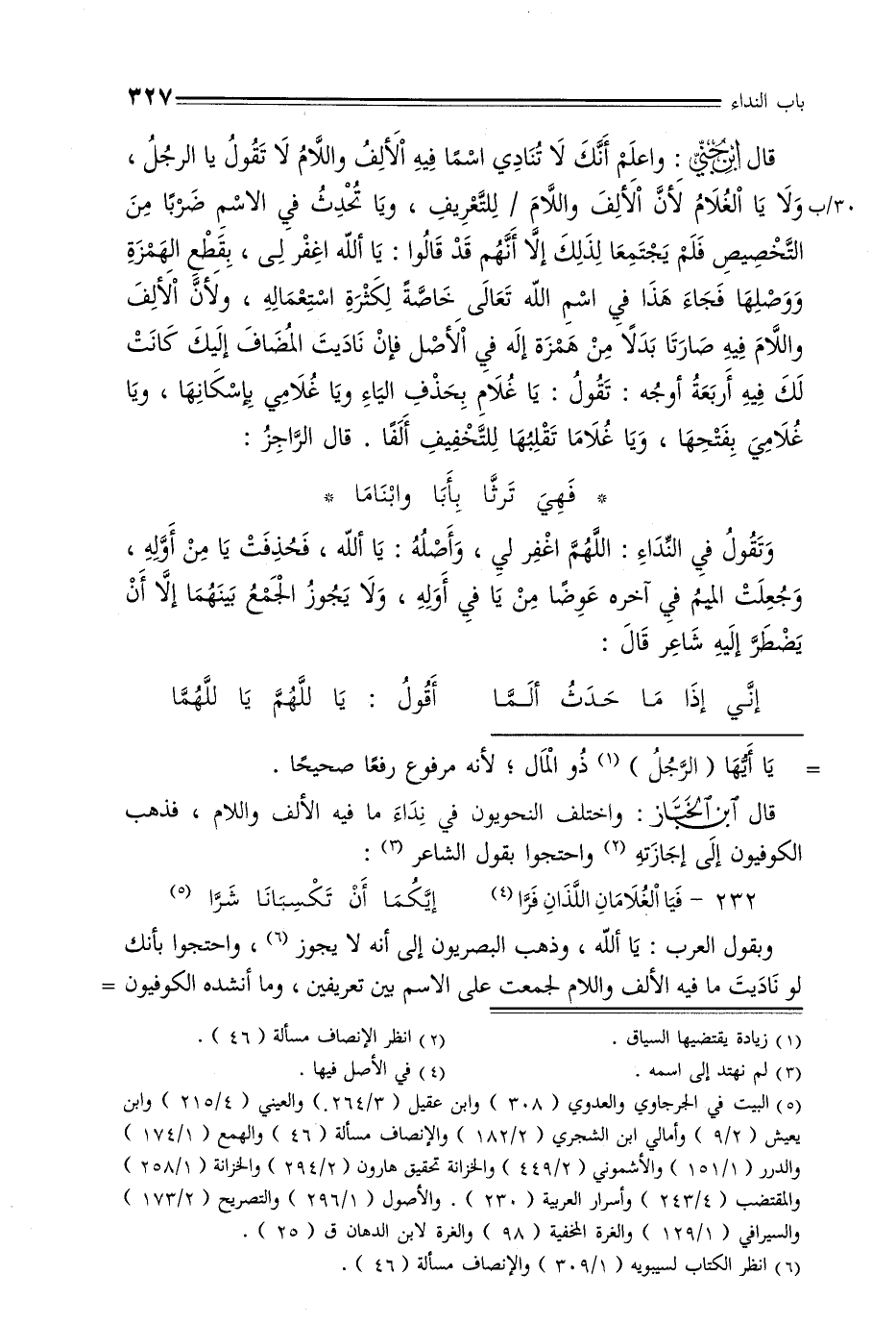 قال ابن جني: واعلم أنك لا تنادي اسمًا فيه الألف واللام لا تقول يا الرجل, 30/ب ولا يا الغلام لأن الألف واللام / للتعريف, ويا تحدث في الاسم ضربًا من التخصيص فلم يجتمعا لذلك إلا أنهم قد قالوا: يا ألله اغفر لي, بقطع الهمزة ووصلها فجاء هذا في اسم الله تعالى خاصة لكثرة استعماله, ولأن الألف واللام فيه صارتا بدلاً من همزة إله في الأصل فإن ناديت المضاف إليك كانت لك فيه أربعة أوجه: تقول: يا غلام بحذف الياء ويا غلامي بإسكانها, ويا غلامي بفتحها, ويا غلاما تقلبها للتخفيف ألفا. قال الراجز: