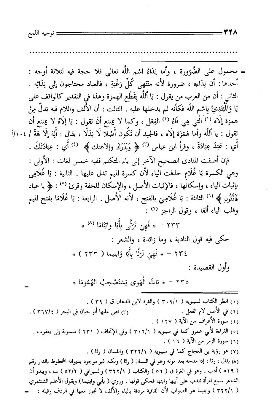 = محمول على الضرورة, وأما نداء اسم الله تعالى فلا حجة فيه لثلاثة أوجه: أحدها: أن نداءه, ضرورة لأنه منتهى كل رغبة, فالعباد محتاجون إلى ندائه. الثاني: أن من العرب من يقول: يا ألله بقطع الهمزة وهذا في التقدير كالواقف على يا والمبتدئ باسم الله فكأنه لم يدخلها عليه. الثالث: أن الألف واللام فيه بدل من همزة إلاه التي هي فاء الفعل, وكما لا يمتنع أن تقول: يا إلاه لا يمتنع أن تقول: يا ألله وأما همزة إلاه, فالجيد أن تكون أصلًا لا بدلًا, يقال: ألة إلا هة / 104/ أأي: عبد عبادة, وقرأ ابن عباس {ونذرك وإلاهتك} أي: عبادتك.