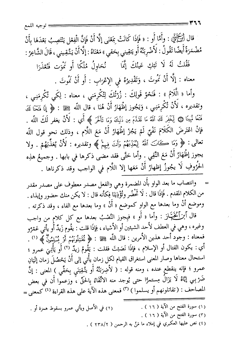 وأما «اللام»: فنحو قولك: زرتك لتكرمني, معناه: لكي تكرمني, وتقديره, لأن تكرمني, ويجوز إظهار أن هنا, قال الله عز وجل: {إنا فتحنا لك فتحًا مبينًا * ليغفر لك الله ما تقدم من ذنبك وما تأخر} أي: لأن يغفر لك الله. فإن اعترض الكلام نفي لم يجز إظهار أن مع اللام, وذلك نحو قول الله تعالى: {وما كان الله ليعذبهم وأنت فيهم} وتقديره: لأن يعذبهم. ولا يجوز إظهار أن مع النفي. وأما حتى فقد مضى ذكرها في بابها. وجميع هذه الحروف لا يجوز إظهار أن معها إلا اللام في الواجب وقد ذكرناها.