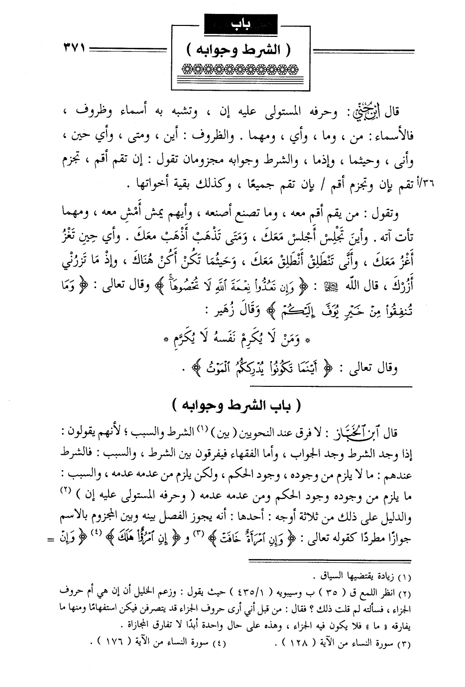 قال ابن الخباز: لا فرق عند النحويين (بين) الشرط والسبب, لأنهم يقولون: إذا وجد الشرط وجد الجواب, وأما الفقهاء فيفرقون بين الشرط, والسبب: فالشرط عندهم: ما لا يلزم من وجوده, وجود الحكم, ولكن يلزم من عدمه عدمه, والسبب: ما يلزم من وجوده وجود الحكم ومن عدمه عدمه (وحرفه المستولى عليه إن) والدليل على ذلك من ثلاثة أوجه: أحدها: أنه يجوز الفصل بينه وبين المجزوم بالاسم جوازًا مطردًا كقوله تعالى: {وإن امرأة خافت} و {إن امرؤًا هلك} {وإن