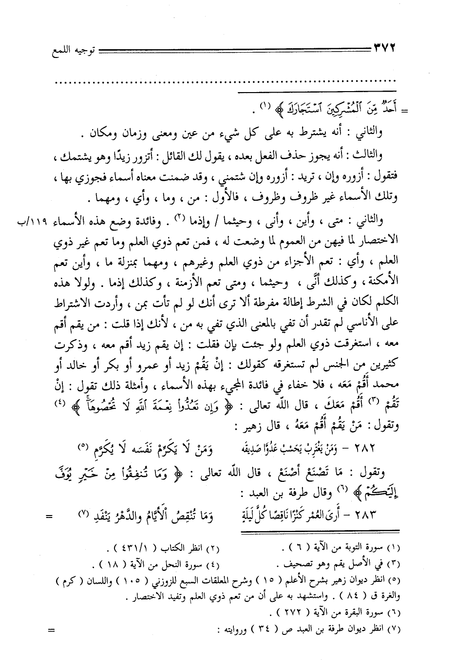 والثاني: متى, وأين, وأنى, وحيثما / وإذما. وفائدة وضع هذه الأسماء 119/ب الاختصار لما فيهن من العموم لما وضعت له, فمن تعم ذوي العلم وما تعم غير ذوي العلم, وأي: تعم الأجزاء من ذوي العلم وغيرهم, ومهما بمنزلة ما, وأين تعم الأمكنة, وكذلك أنى, وحيثما, ومتى تعم الأزمنة, وكذلك إذما. ولولا هذه الكلم لكان في الشرط إطالة مفرطة ألا ترى أنك لو لم تأت بمن, وأردت الاشتراط على الأناسي لم تقدر أن تفي بالمعنى الذي تفي به من, لأنك إذا قلت: من يقم أقم معه, استغرقت ذوي العلم ولو جئت بإن فقلت: إن يقم زيد أقم معه, وذكرت كثيرين من الجنس لم تسغرقه كقولك: إن يقم زيد أو عمرو أو بكر أو خالد أو محمد أقم معه, فلا خفاء في فائدة المجيء بهذه الأسماء, وأمثلة ذلك تقول: إن تقم أقم معك, قال الله تعالى: {وإن تعدوا نعمة الله لا تحصوها} وتقول: من يقم أقم معه, قال زهير: