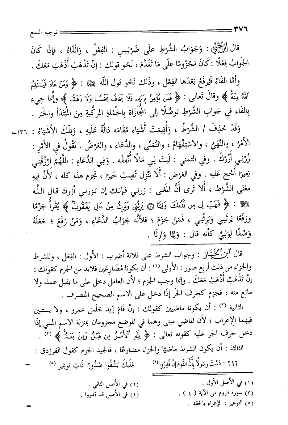 وقد حذف / الشرط, وأقيمت أشياء مقامه دالة عليه, وتلك الأِياء: 36/ب الأمر, والنهي, والاستفهام, والتمني, والدعاء, والعرض. تقول في الأمر: زرني أزرك. وفي التمني: ليت لي مالًا أنفقه. وفي الدعاء: اللهم ارزقني بعيرًا أحد عليه. وفي العرض: ألا تنزل تصب خيرًا, تجزم هذا كله, لأن فيه معنى الشرط, ألا ترى أن المعنى: زرني فإنك إن تزرني أزرك قال الله عز وجل: {فهب لي من لدنك وليًا * يرثني ويرث من آل يعقوب} يقرأ جزمًا ورفعًا يرثني ويرقني, فمن جزم, فلأنه جواب الدعاء, ومن رفع, جعله وصفًا لولي كأنه قال: وليًا وارثًا.