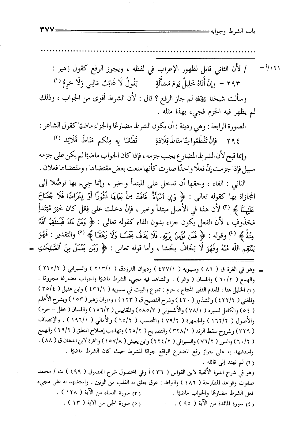 الثاني: الفاء, وحقها أن تدخل على المبتدأ والخبر, وإنما جيء بها توصلًا إلى المجازاة بها كقوله تعالى: {وإن امرأة خافت من بعلها نشوزًا أو إعراضًا فلا جناح عليهما} لأن هذا في الأًل مبتدأ وخبر, فإن دخلت على فعل كان خبر مبتدأ محذوف, لأن الفعل يكون جزاء بدون الفاء كقوله تعالى: {ومن عاد فينتقم الله منه} وقوله: {فمن يؤمن بربه فلا يخاف بخسًا ولا رهقًا} والتقدير: فهو ينتقم الله منه وفهو لا يخاف بخسًا, وأما قوله تعالى: {ومن يعمل من الصالحات
