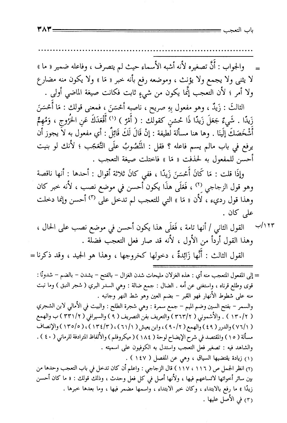 = والجواب: أن تصغيره لأنه أشبه الأسماء حيث لم يتصرف, وفاعله ضمير «ما» لا يثنى ولا يجمع ولا يؤنث, وموضعه رفع بأنه خبر «ما» ولا يكون منه مضارع ولا أمر, لأن التعجب إنما يكون من شيء ثابت فكانت صيغة الماضي أولى.
