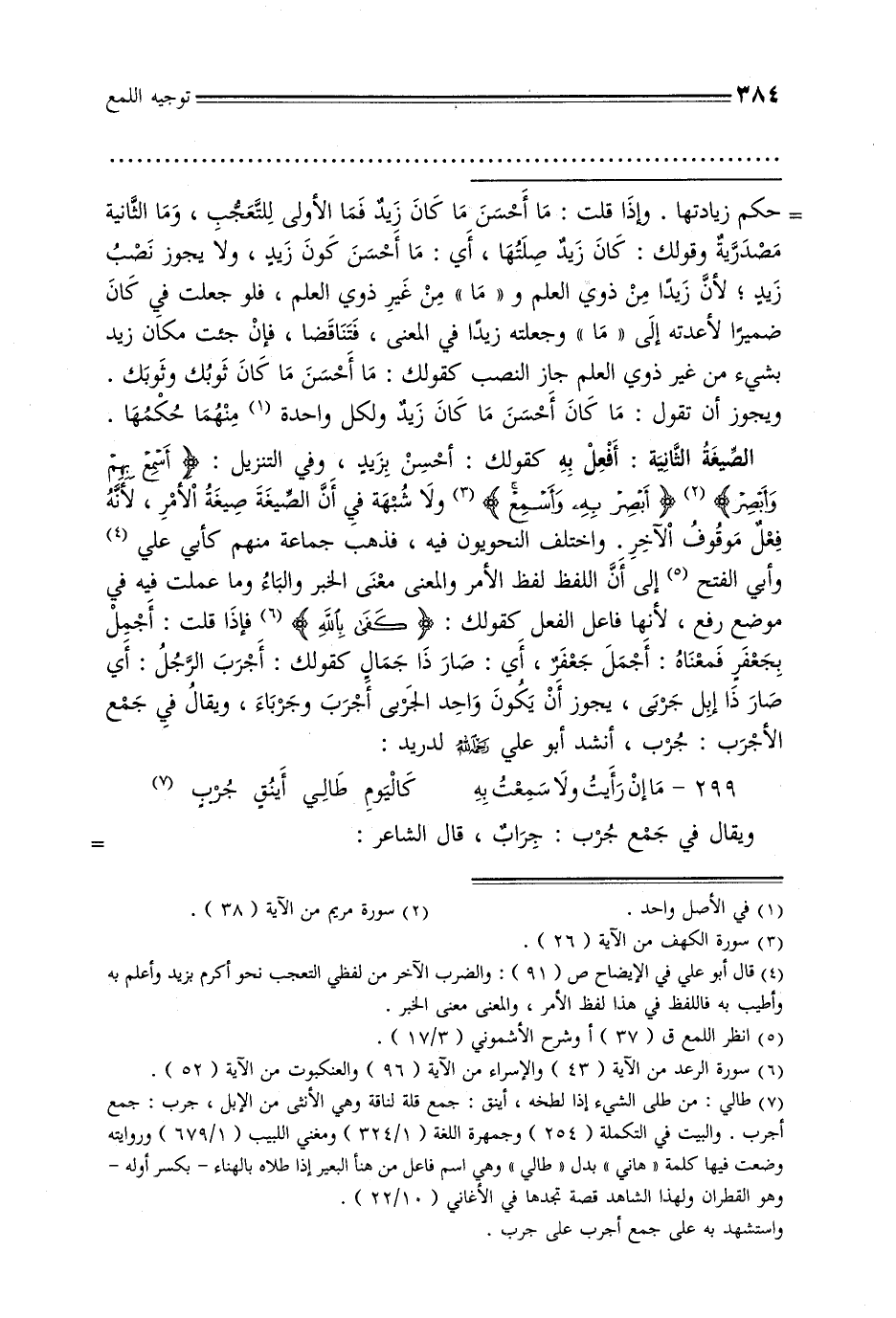 الصيغة الثانية: أفعل به كقولك: أحسن بزيد, وفي التنزيل: {أسمع بهم وأبصر} {أبصر به وأسمع} ولا شبهة في أن الصيغة صيغة الأمر, لأنه فعل موقوف الآخر. واختلف النحويون فيه, فذهب جماعة منهم كأبي علي وأبي الفتح إلى أن اللفظ لفظ الأمر والمعنى معنى الخبر والباء وما عملت فيه في موضع رفع, لأنها فاعل الفعل كقولك: {كفى بالله} فإذا قلت: أجمل بجعفر فمعناه: أجمل جعفر, أي صار ذا جمال كقولك: أجرب الرجل: أي صار ذا إبل جربى, يجوز أن يكون واحد الجربى أجرب وجرباء, ويقال في جمع الأجرب: جرب, أنشد أبو عليه رحمه الله لدريد: