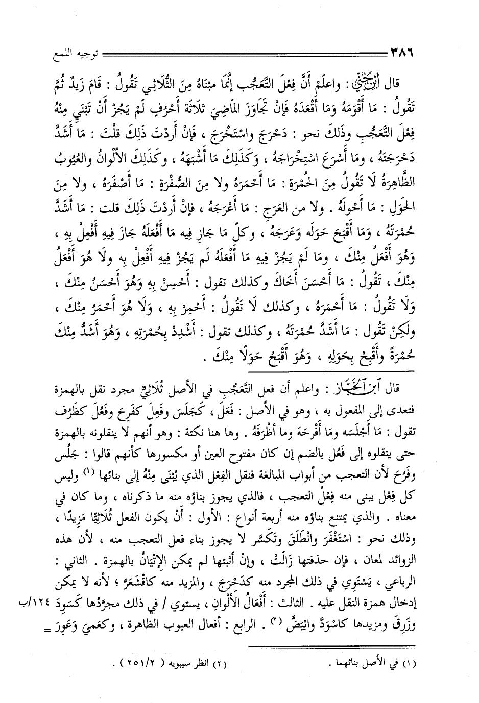 قال ابن جني: واعلم أن فعل التعجب إنما مبناه من الثلاثي تقول: قام زيد ثم تقول: ما أقومه وما أقعده فإن تجاوز الماضي ثلاثة أحرف لم يجز أن تبني منه فعل التعجب وذلك نحو: دحرج واستخرج, فإن أردت ذلك قلت: ما أشد دحرجته, وما أسرع استخراجه, وكذلك ما أشبهه, وكذلك الألوان والعيوب الظاهرة لا تقول من الحمرة: ما أحرمه ولا من الصفرة: ما أصفره, ولا من الحول: ما أحوله. ولا من العرج: ما أعرجه, فإن أردت ذلك قلت: ما أشد حمرته, وما أقبح حوله وعرجه, وكل ما جاز فيه ما أفعله جاز فيه أفعل به, وهو أفعل منك, وما لم يجز فيه ما أفعله لم يجز فيه أفعل به ولا هو أفعل منك, تقول: ما أحسن أخاك وكذلك تقول: أحسن به وهو أحسن منك, ولاتقول: ما أحمره, وكذلك لا تقول: أحمر به, ولا هو أحمر منك, ولكن تقول: ما أشد حمرته, وكذلك تقول: أشدد بحمرته, وهو أشد منك حمرة وأقبح بحوله, وهو أقبح حولًا منك.